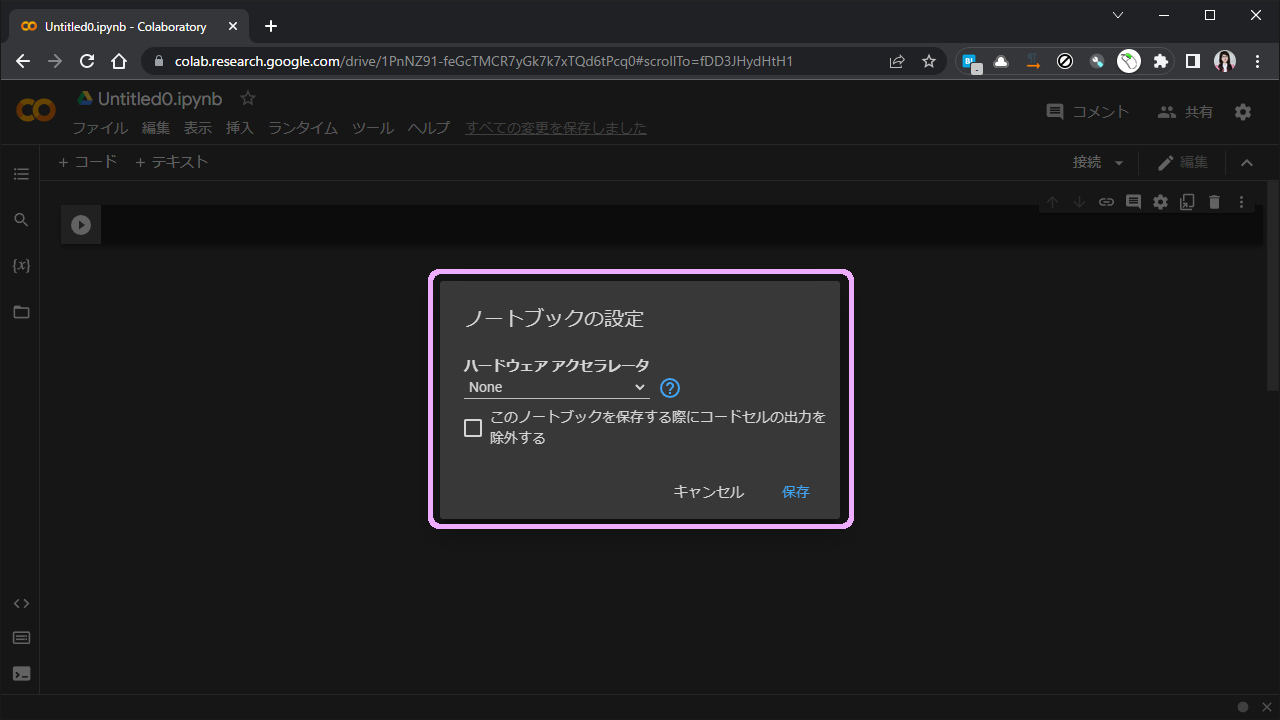 None と書かれている部分をクリックするとプルダウンメニューが出て、GPU や TPU を選ぶことが出来ます。